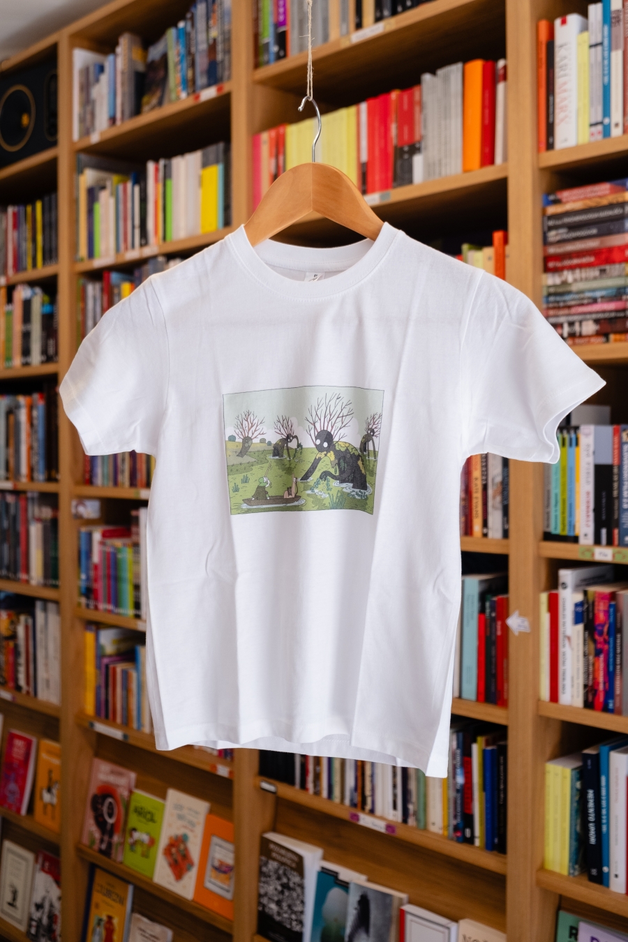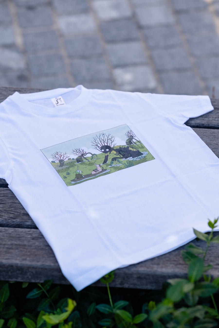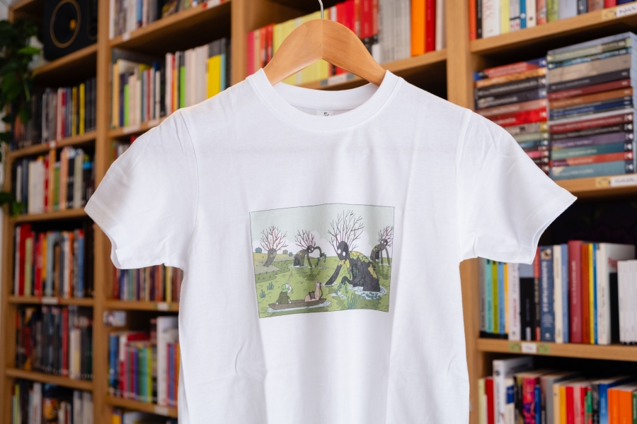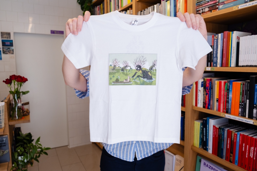 Izbrali smo 3 motive za Tika na otroških majicah: enega osnovnega, kjer Tik nalaga prtljago na alpako, pride z njo v ospredje in pol se napoti v gozd iskat drva (tej se reče Trije Tiki), enega liričnega, kjer Tik in alpaka srečata močvirnike (ta se imenuje Močvirniki) in enega malo strašnega, kjer Tik razloži zmaju, da ne bom nič z malico (ta se imenuje Zmaj). Na voljo so vsakič v dveh velikosti, a ker so bolj majhne, je manjša nekak za otroke do 7 let, večja pa za mularijo do 9 let. Oblikoval jih je Miha Hančič, pofotkal pa jih je Matic Ačko v in pred knjigarno Mariborka.
