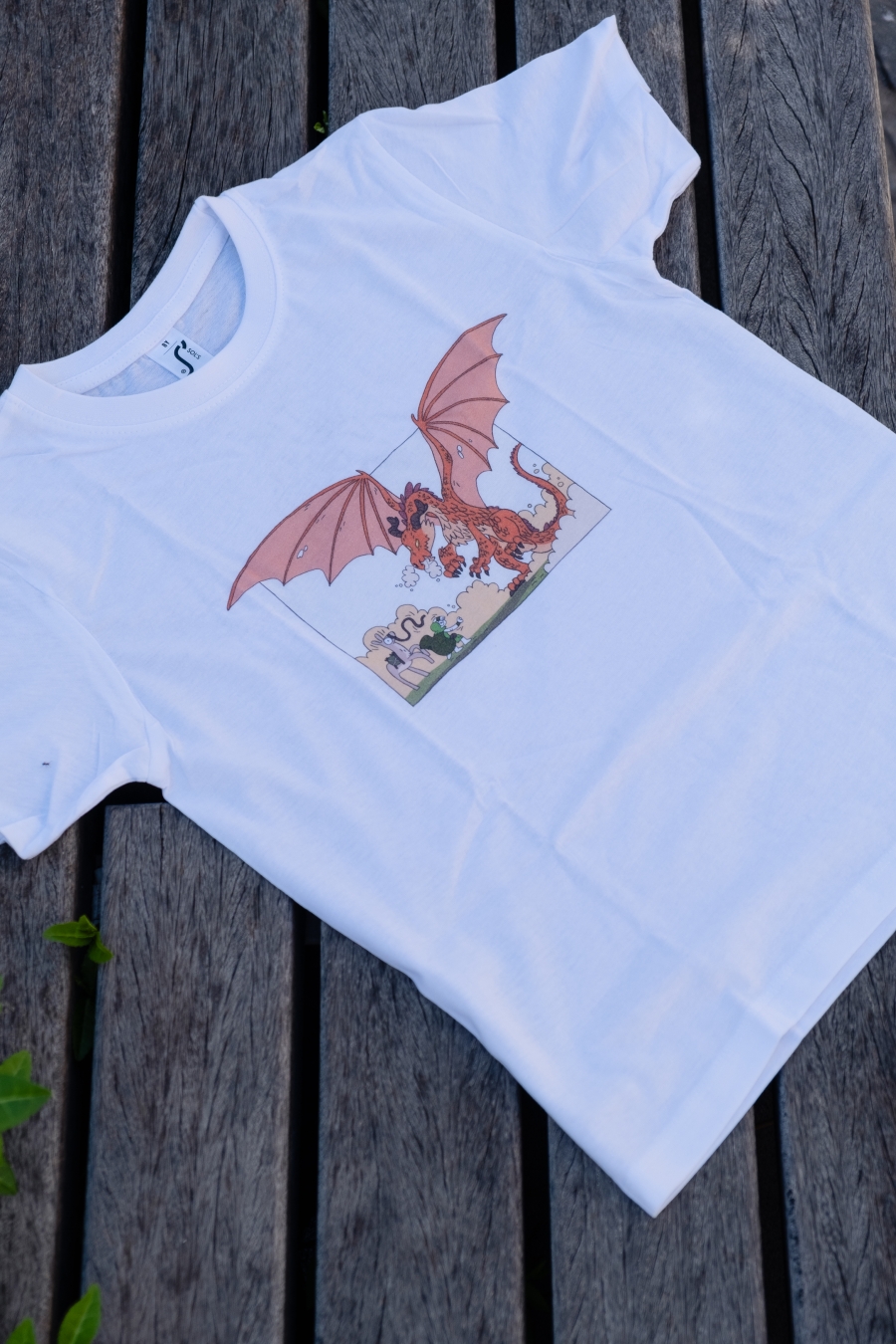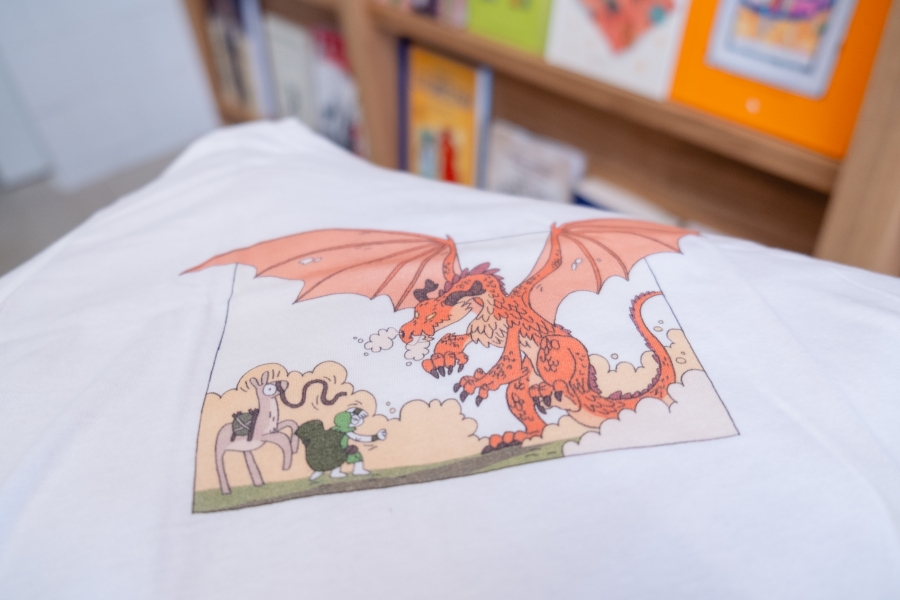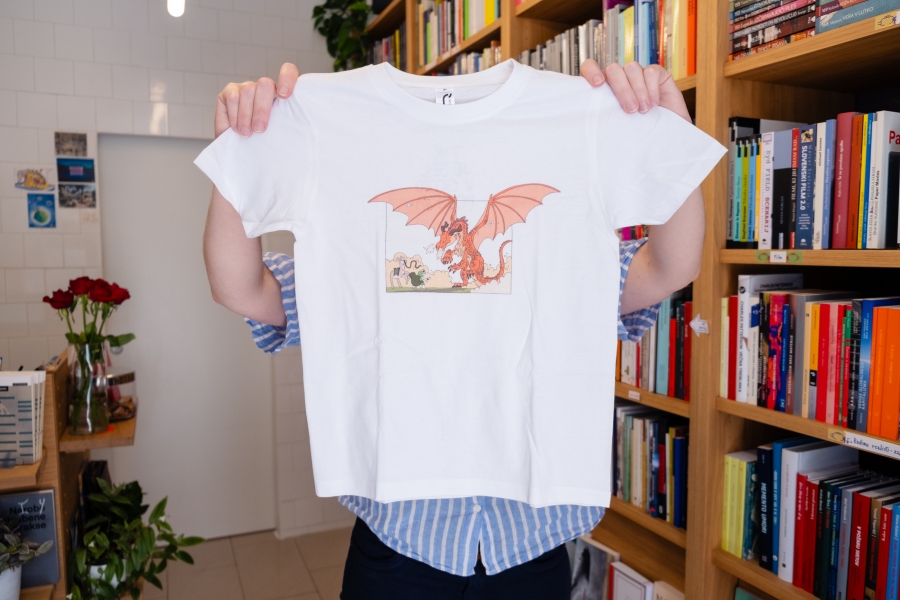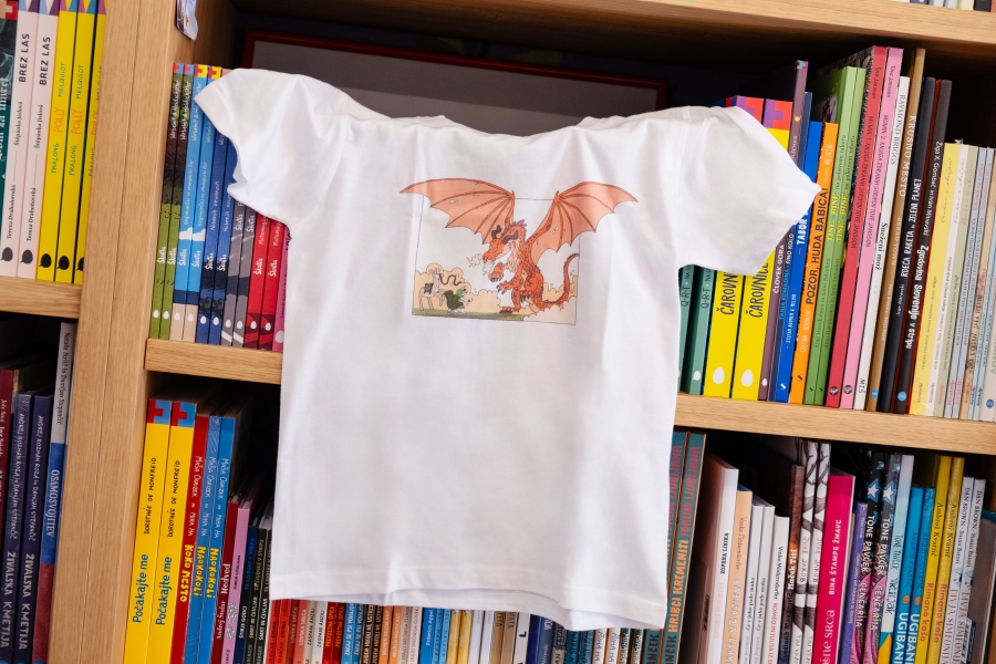 Izbrali smo 3 motive za Tika na otroških majicah: enega osnovnega, kjer Tik nalaga prtljago na alpako, pride z njo v ospredje in pol se napoti v gozd iskat drva (tej se reče Trije Tiki), enega liričnega, kjer Tik in alpaka srečata močvirnike (ta se imenuje Močvirniki) in enega malo strašnega, kjer Tik razloži zmaju, da ne bom nič z malico (ta se imenuje Zmaj). Na voljo so vsakič v dveh velikosti, a ker so bolj majhne, je manjša nekak za otroke do 7 let, večja pa za mularijo do 9 let. Oblikoval jih je Miha Hančič, pofotkal pa jih je Matic Ačko v in pred knjigarno Mariborka.